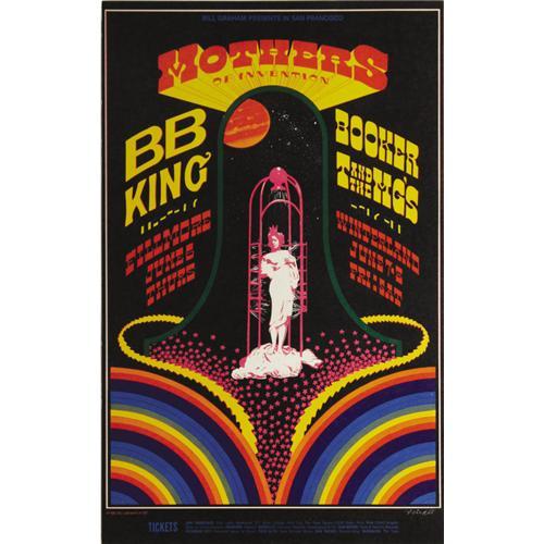 <B>Mothers of Invention Fillmore/Winterland Concert Poster #BG123 (Bill Graham, 1968)</B></I> Back in the heady days of 1968, it didn't get much more "far out" than Frank Zappa and the Mothers of Invention! Here's a pretty far out Bob Fried-designed poster for a three night run at the Fillmore (June 6) and Winterland (June 7 and 8), in '68. Opening for the band was bluesman B. B. King and the Memphis instrumental combo Booker T. and the MG's. This very colorful poster was never reprinted; it measures 13.75" x 22" and is in NM- condition.