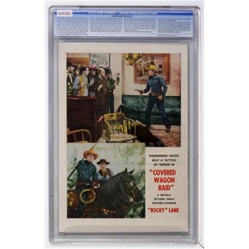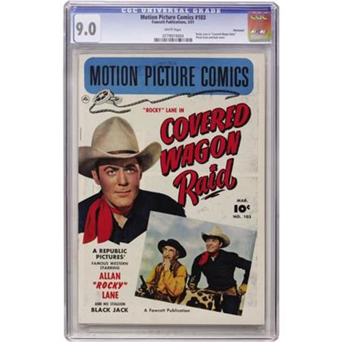 <B>Motion Picture Comics #103 "Covered Wagon Raid" (Fawcett, 1951) CGC VF/NM 9.0 White pages.</B></I> More white-paged greatness from the Vancouver pedigree. In this third issue of the title, Rocky Lane is featured in "Covered Wagon Raid" and in front and back cover photos, along with his horse Black Jack and sidekick Nugget Clark. Overstreet 2007 VF/NM 9.0 value = $222; NM- 9.2 value = $300. CGC census 6/07: 1 in 9.0, 1 higher.<BR><BR><b>Shipping:</b> Comics - Slabbed (certified) (<a target="_blank" href="http://www.heritageauctions.com/common/shipping.php">view shipping information</a>)