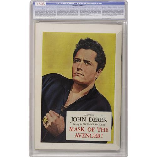 <B>Motion Picture Comics #108 Mask of the Avenger - Crowley Copy pedigree (Fawcett, 1952) CGC NM+ 9.6 Off-white to white pages.</B></I> This issue sports a photo cover featuring John Derek, lucky devil who, at various intervals, was married to Ursula Andress, Linda Evans, and Bo Derek. This is the highest graded copy certified by CGC to date. Overstreet 2006 NM- 9.2 value = $210. CGC census 10/06: 1 in 9.6, none higher.<BR><BR><b>Shipping:</b> Slabbed Comic (<a target="_blank" href="http://www.heritageauctions.com/common/shipping.php">view shipping information</a>)