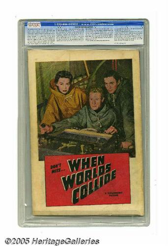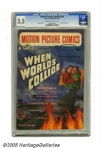 <B>Motion Picture Comics #110 "When Worlds Collide" (Fawcett, 1952) CGC VG- 3.5 Cream to off-white pages.</B></I> George Evans art. Evans and Al Williamson make an appearance in the story. Overstreet 2005 VG 4.0 value = $192. CGC census 1/05: 1 in 3.5, 5 higher. <I>From the collection of Chris Bell.</B></I>