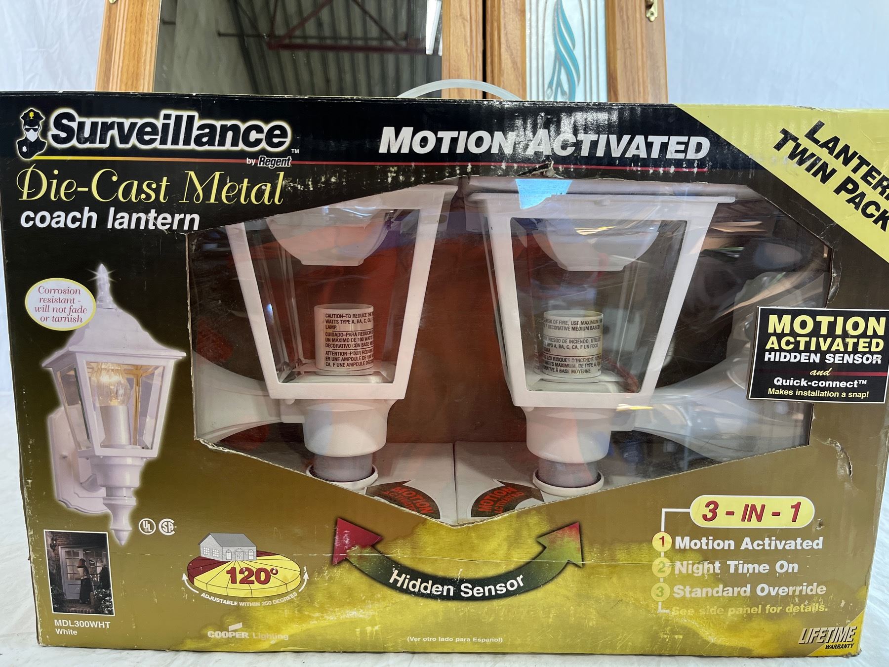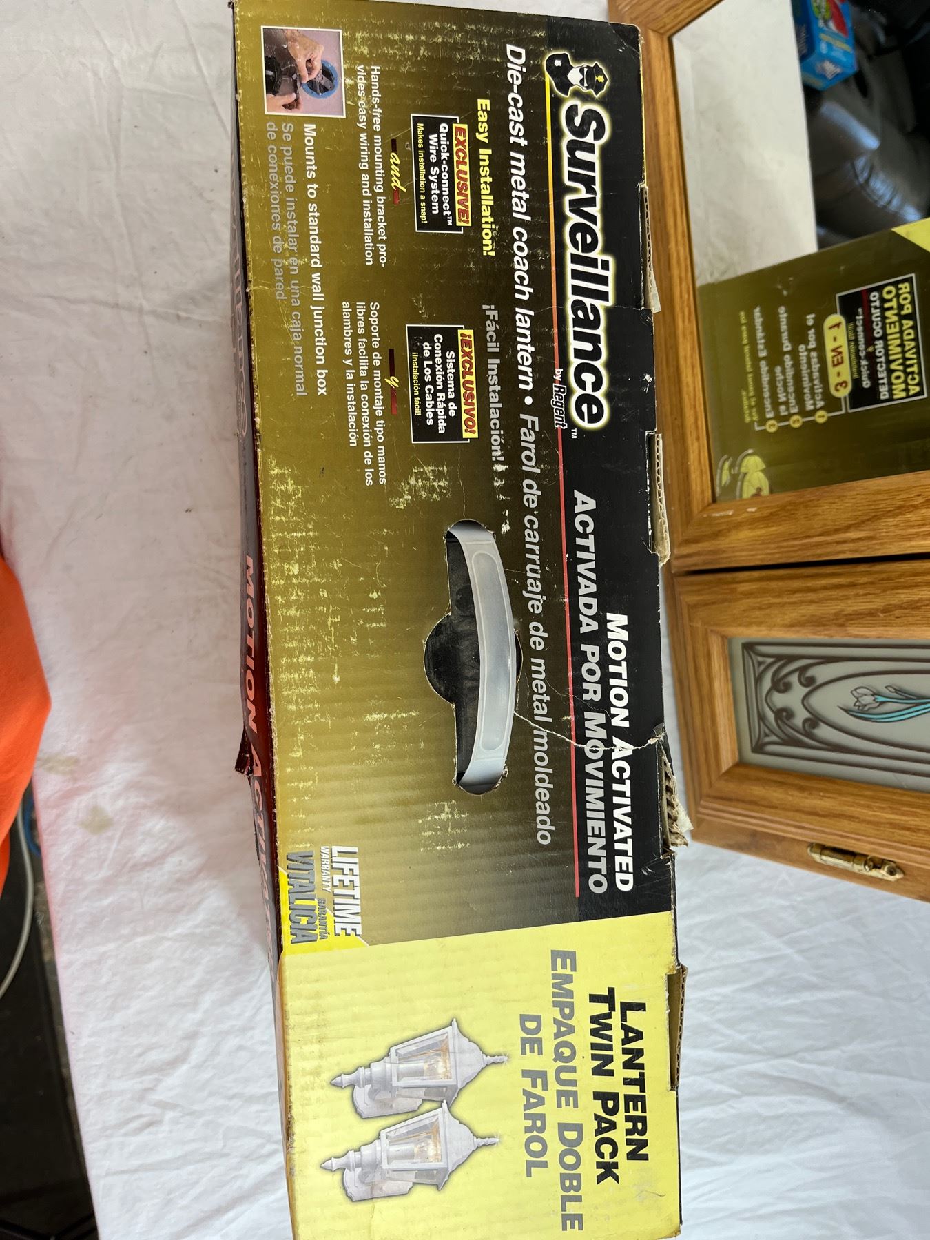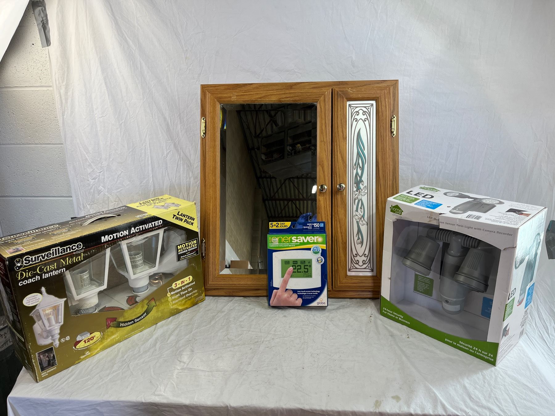 Mirrored medicine cabinet with household LED motion sensor lights and thermostat group lot.
