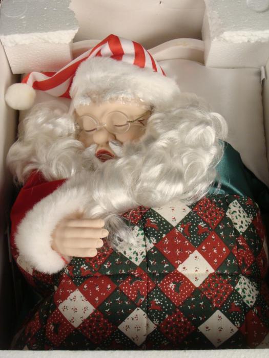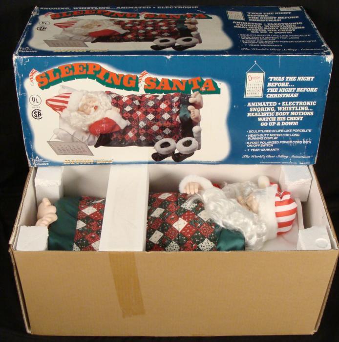 Don't wake Santa--he needs his rest! And rest he does, with comical snoring sounds, and up and down chest motion. This animated moving figure is a Motion-ette from Elco. He is about 24" long, made of soft plush construction called Porelite. It is in excellent and working condition in the original box. Just plug it in. The box has shelf wear.