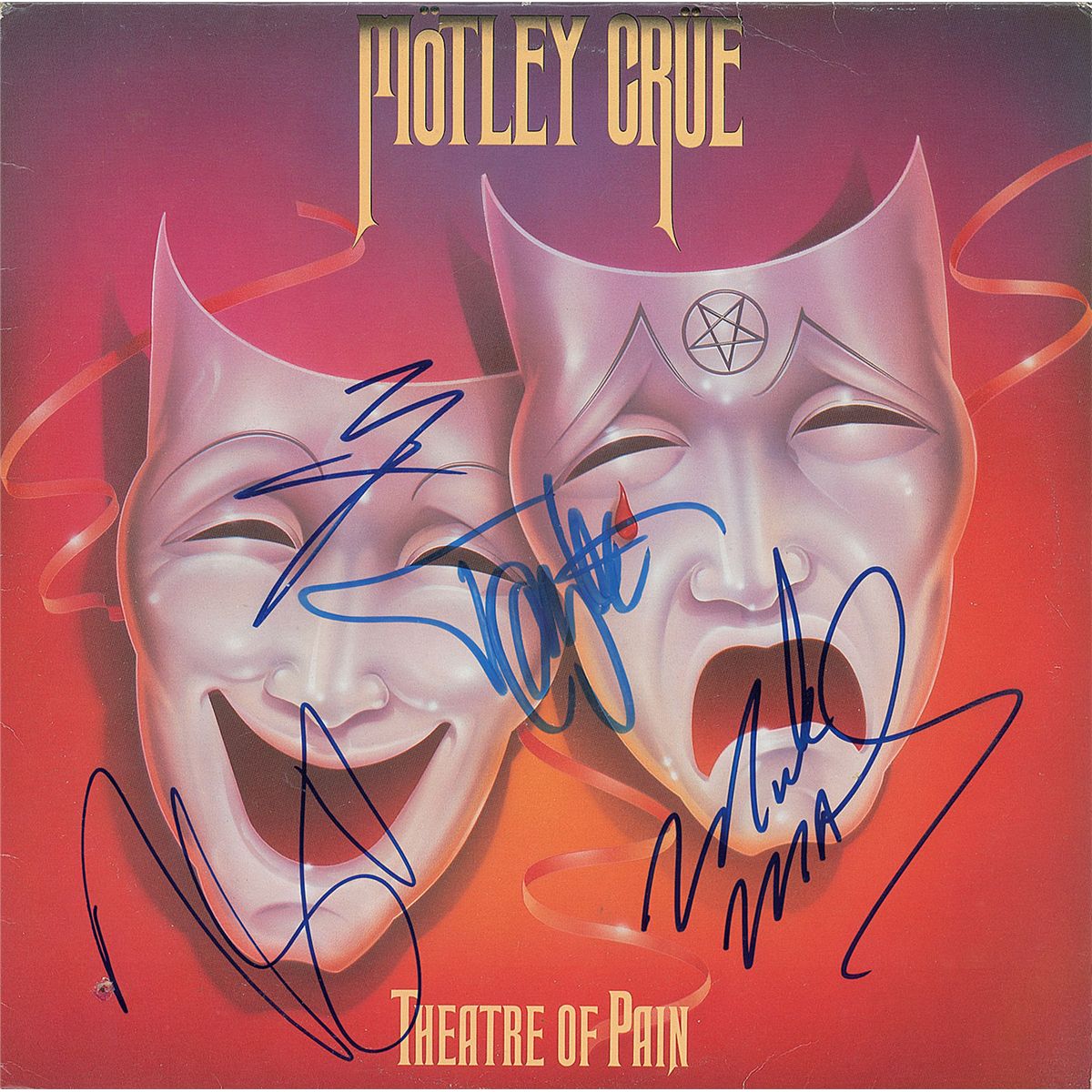 Theatre of Pain album signed on the front cover in blue felt tip by Vince Neil, Nikki Sixx, Tommy Lee, and Mick Mars. In fine condition, with some light creases and a small hole to the lower left. The record is included. Signatures of all four band members will soon be quite difficult to obtain, as the band has begun their farewell tour and signed a ‘cessation of touring agreement’ which will prevent them from touring under the Motley Crue name beyond the end of 2015.
