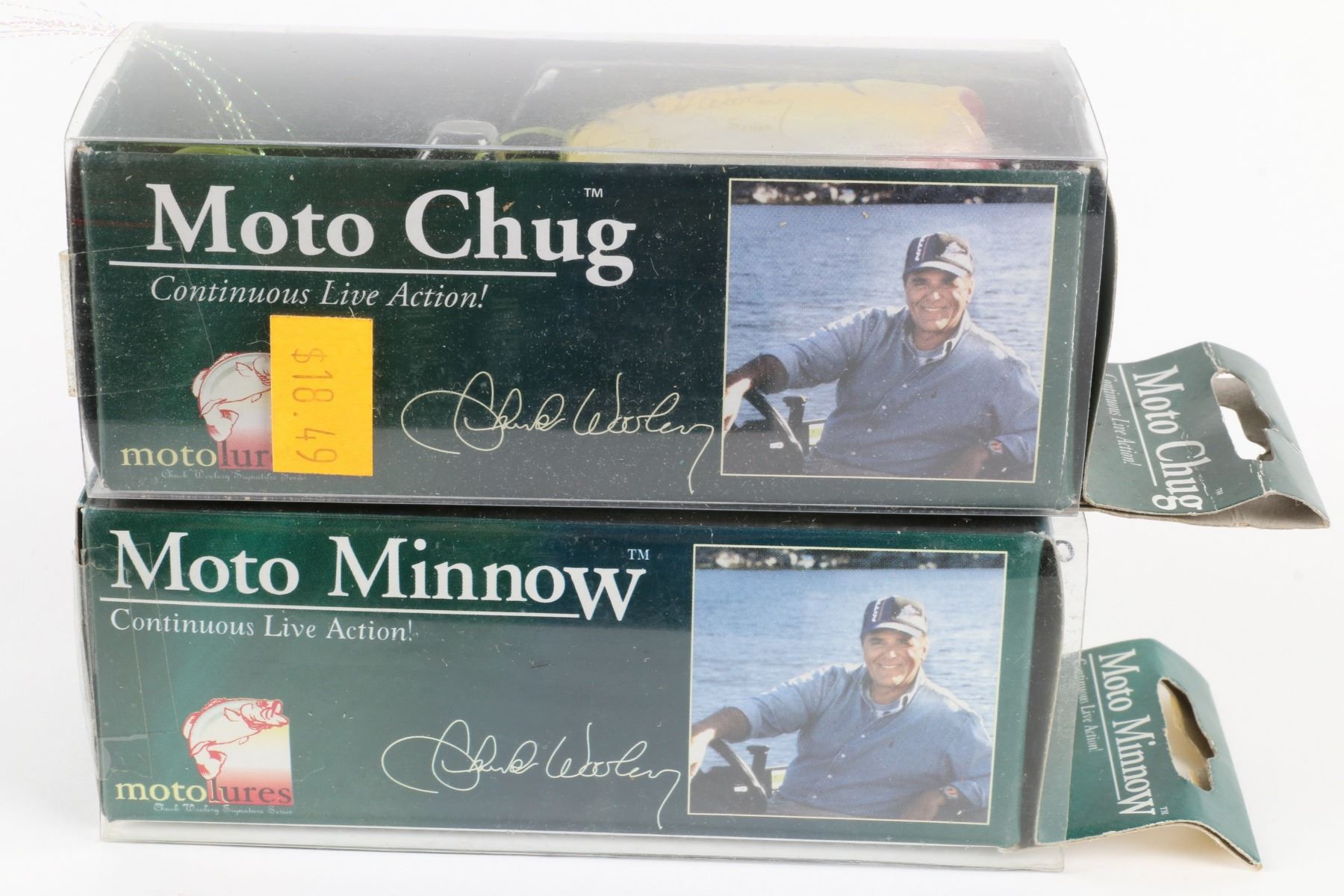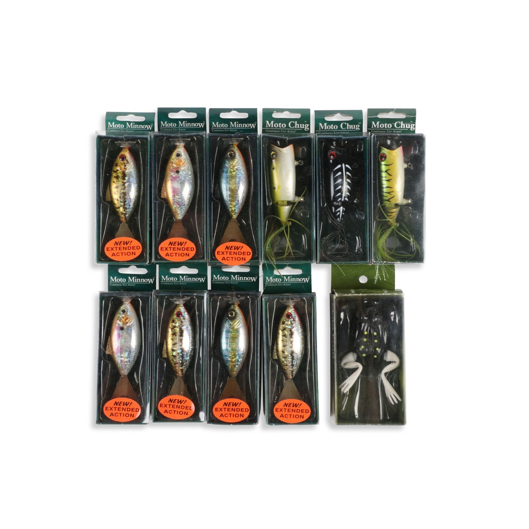 1 Moto Frog, 7 Minnows and 3 Chugs, Various Origins. Boxed. Material: Mixed. Quantity: 11. Grade: EX+. 5" x 2" x 2" Est. $50-75.