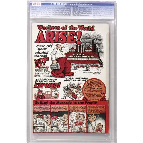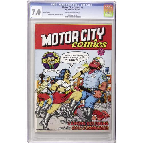 <B>Motor City Comics #1 Second Printing R. Crumb (Rip Off Press, 1969) CGC FN/VF 7.0 Off-white to white pages.</B></I> All that keeps this early R. Crumb classic comic from "first printing" status is a copyright symbol on the inside front cover! All Robert Crumb art. Fogel's Underground Price Guide 6.0 value = $60; NM 9.4 value = $100. CGC census 12/06: 1 in 7.0, 1 higher. Adult content. Key words: R. Crumb, Robert Crumb, Underground Comix.<BR><BR><b>Shipping:</b> Slabbed Comic (<a target="_blank" href="http://www.heritageauctions.com/common/shipping.php">view shipping information</a>)