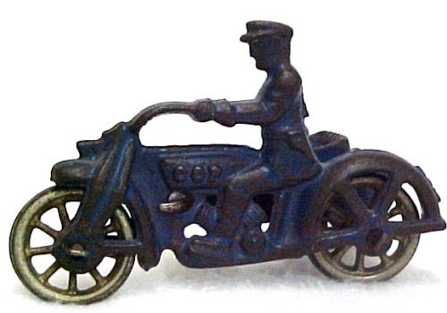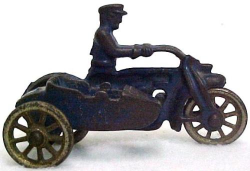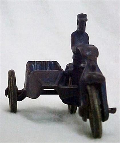 Motorcycle Cop with Sidecar; painted blue cast iron with three metal wheels; 4" across; some paint loss throughout.