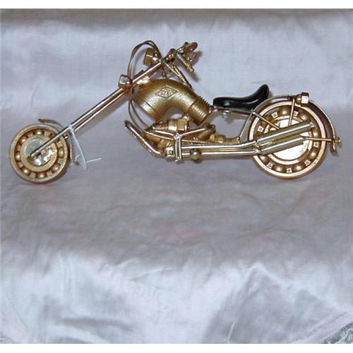 This unique motorcycle is probably handmade of pipes, screws, bolts and nuts. It is gold with a black seat. There is a second one listed. Buyer pays shipping and handling costs.