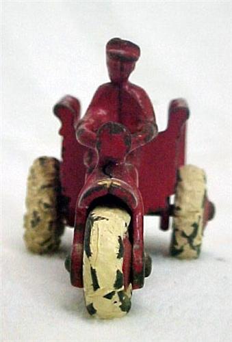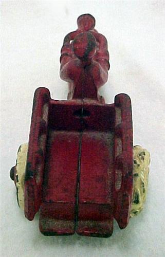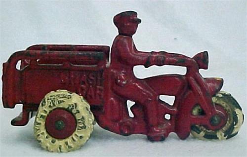 Motorcycle with Rider and three wheels; painted red cast iron with white rubber tires; marked "crash car" and 1947; some paint loss throughout.