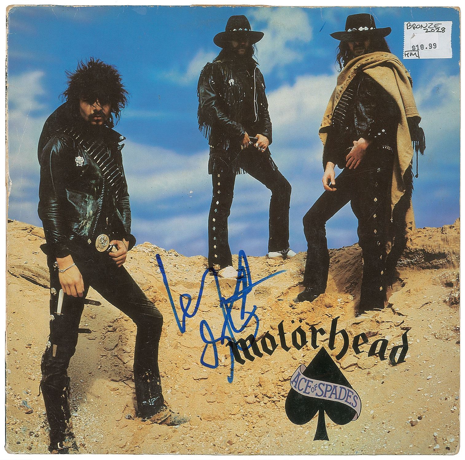 Ace of Spades album signed on the front cover in blue felt tip by Lemmy Kilmister. In very good condition, with creasing, edge wear, surface impressions, and an affixed price sticker. The record is included. A hard rock/heavy metal classic signed by the band's late and legendary frontman.