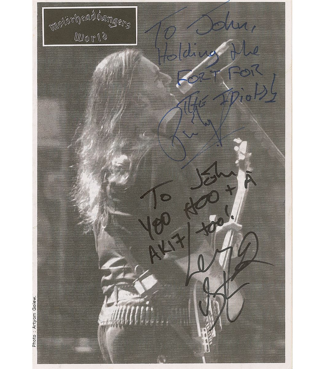 Motorheadbangers World magazine, December 1999, 8.25 x 11.5, 16 pages, signed and inscribed in felt tip on the front cover, “To John, Yoo hoo & a AK47 too! Lemmy Kilmister,” and, “To John, Holding the fort for the idiots! Phil Campbell,” and on a page inside, “To John, Mikkey Dee, ’00.” In fine condition, with light scattered creases. Fully band signed items are uncommon.