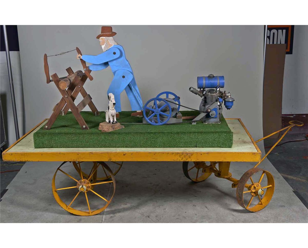 Consists of a gasoline powered old timer cutting a log with a dog wagging his tail. Includes a railroad luggage cart with wood deck and iron wheels. Motor is a Lausen Company Type RSC-391 - Not tested. Condition (Good). Size 45" x 78" .