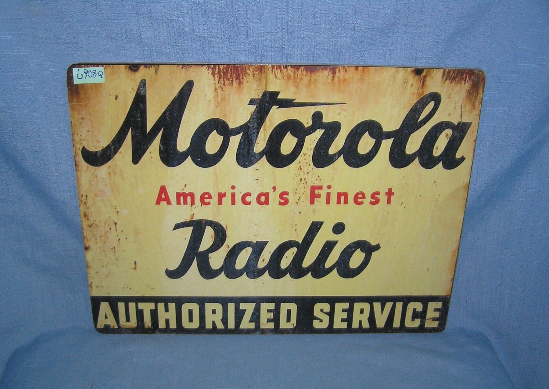 Motorola Americas Finest radio authorized service retro style advertising sign printed on PVC hardboard these signs are auctioned for their decorative and display purposes 12 inches by 16 inches est. value $40.00-$50.00