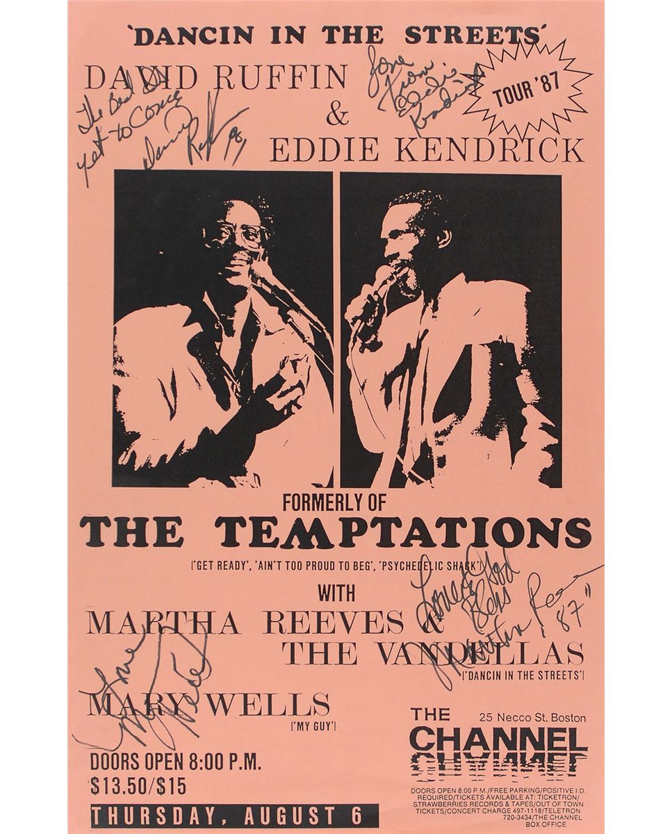 Poster advertising a ‘Dancin’ in the Streets’ concert during David Ruffin and Eddie Kendrick’s 1987 tour, 11 x 17, signed in black felt tip by Ruffin, Kendrick, Martha Reeves, and Mary Wells. In fine condition.