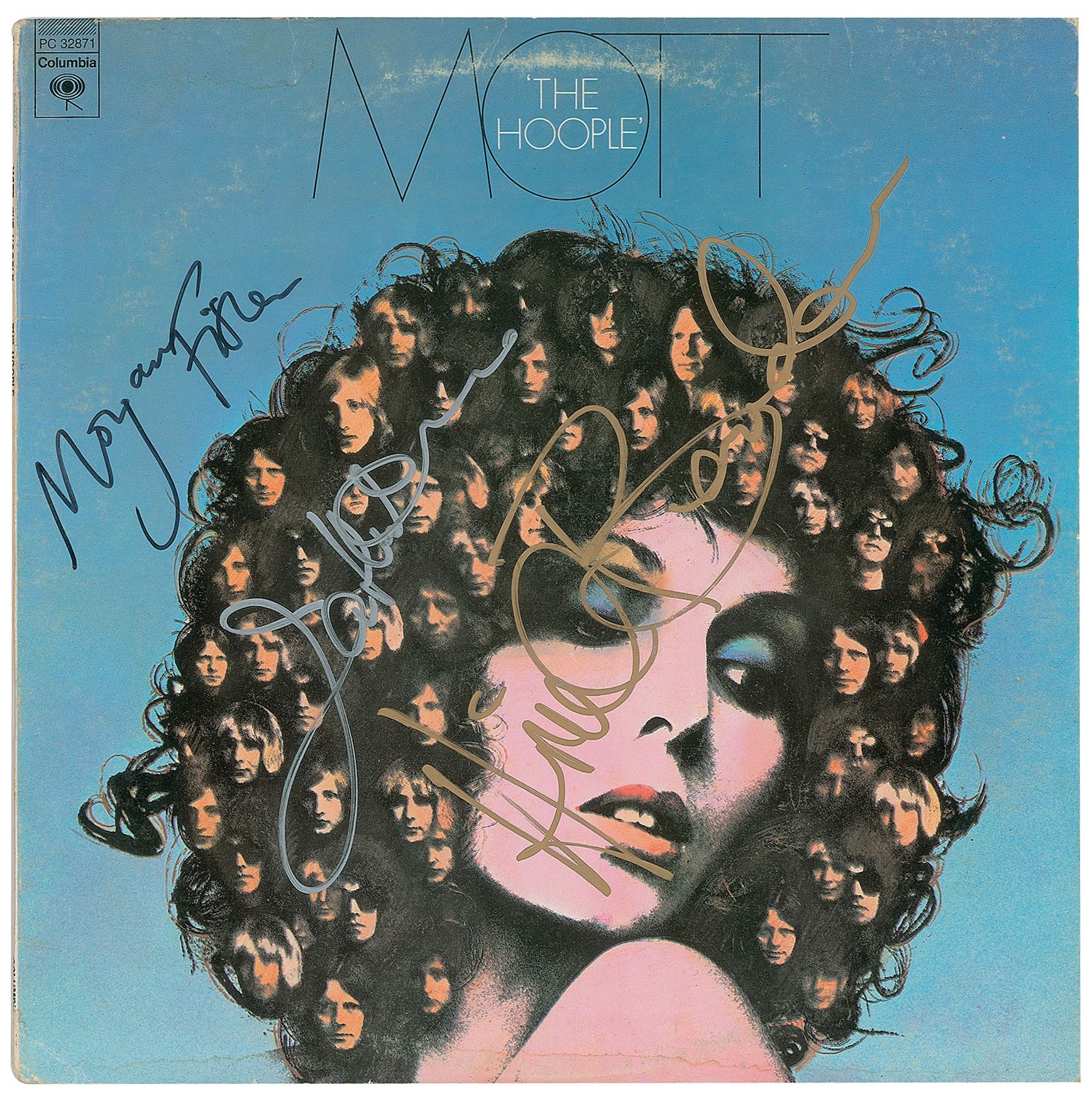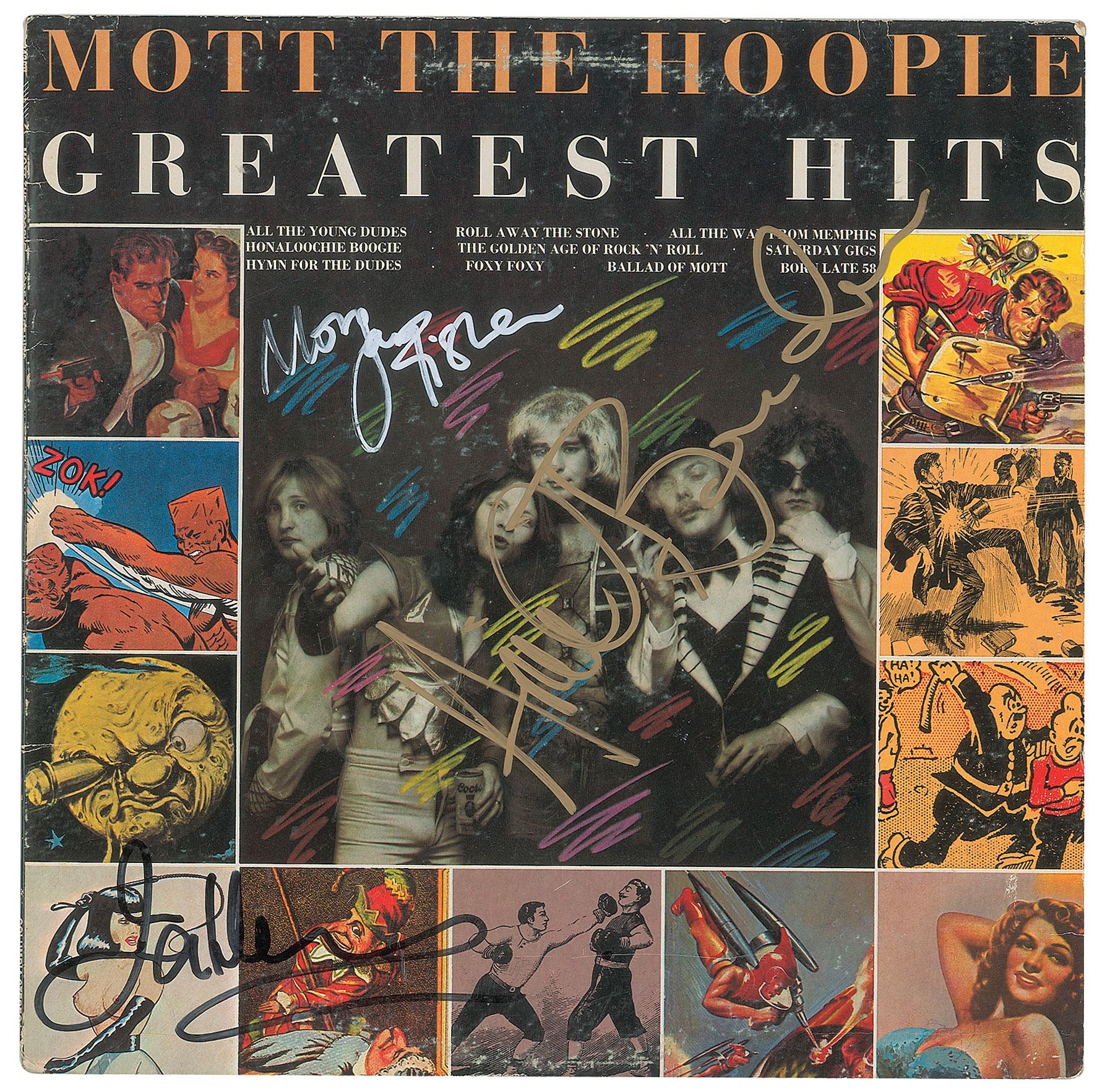 Four albums signed on the front cover by members of Mott the Hoople, including: The Hoople by Mott the Hoople, signed in silver ink by Ian Hunter, in gold ink by Ariel Bender, and in black felt tip by Morgan Fisher; Greatest Hits by Mott the Hoople, signed in black felt tip by Hunter, in gold ink by Bender, and in white paint pen by Fisher; and You're Never Alone with a Schizophrenic and All American Alien Boy by Ian Hunter, who signs both in blue or black felt tip. In overall fine condition, with light scuffing, and an ownership notation to the Schizophrenic album. The records are included. Consignor notes that all of the signatures were obtained at the Schofield Hotel in Cleveland following their show at the Masonic Temple.