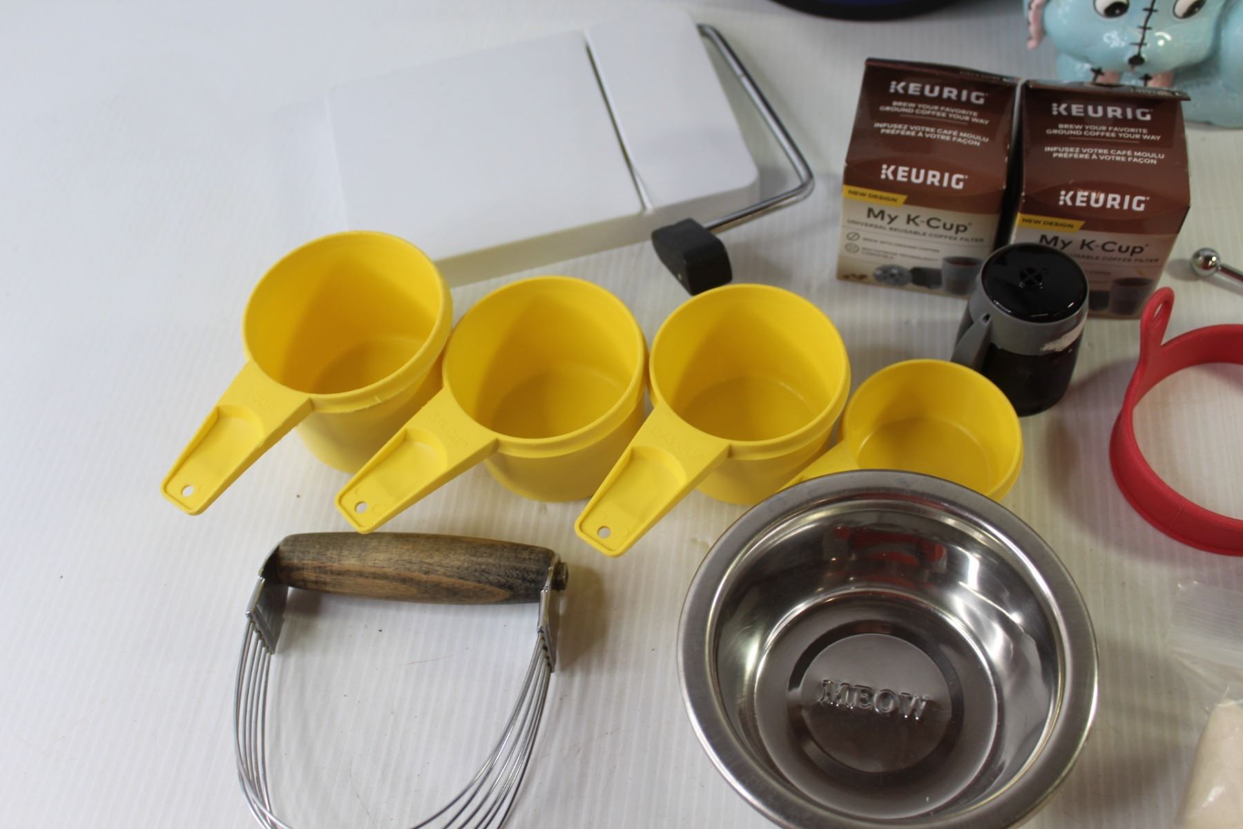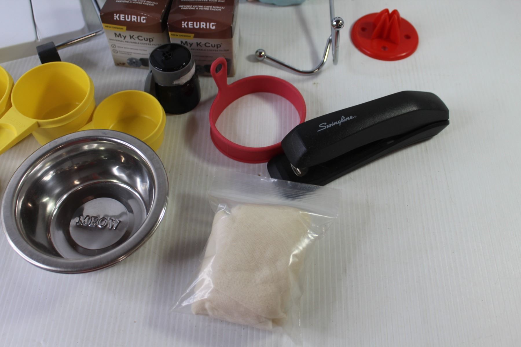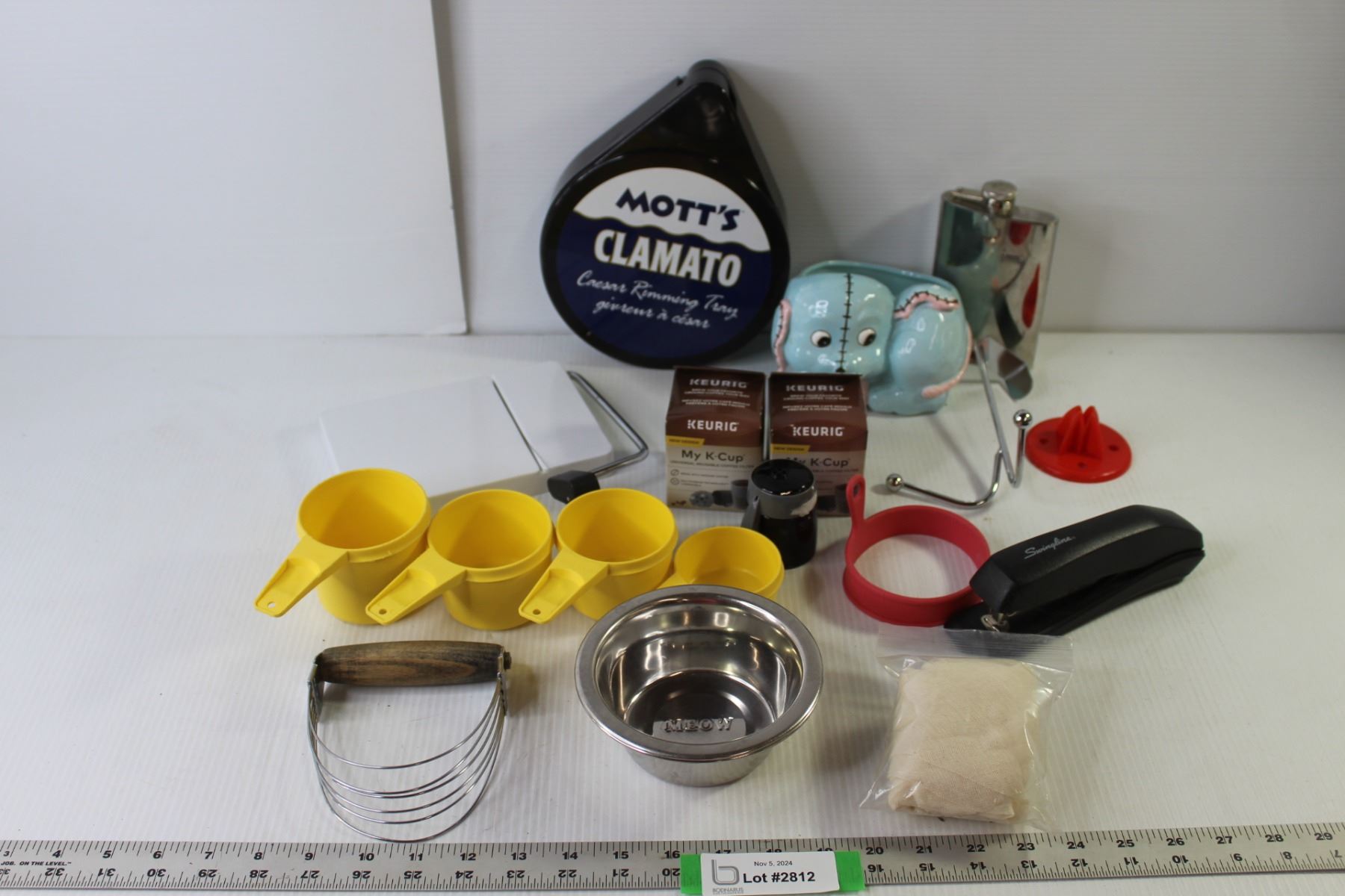 Motts Clamato Caesar Rimming Tray, Ceramic Stitched Puppy Storage, Flask, (3) K-Cup Reusable Coffee Filter (2 NIB), Set 4 Measure Cups, Meow Food Bowl, Swingline Stapler, Door Hanger, Cheese Slicer, misc.