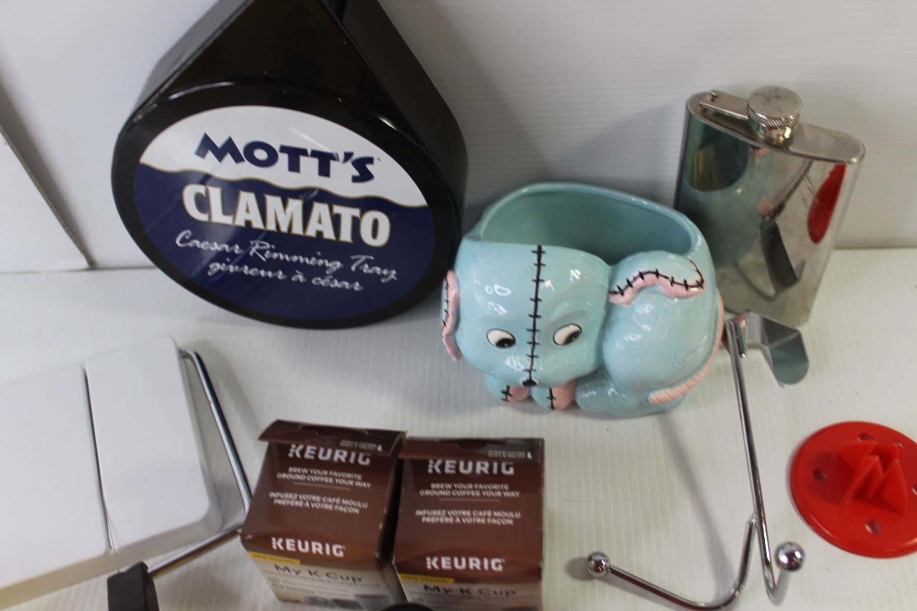 Motts Clamato Caesar Rimming Tray, Ceramic Stitched Puppy Storage, Flask, (3) K-Cup Reusable Coffee