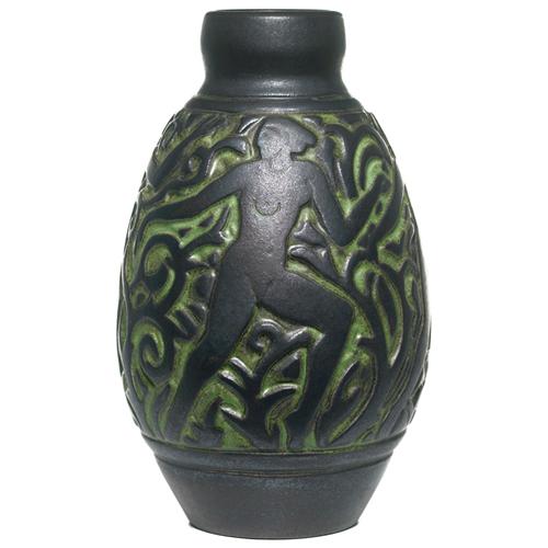 Excellent Mougin vase, swollen form with deeply carved design of three nudes in brown against a green ground, marked, artist signed,11in.h, large decorative example