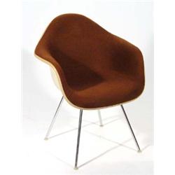 Moulded fibreglass and brown upholstered chair on chrome legs,