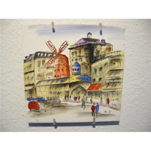 i like Paris. i like Moulin Rouge. this tile has beautiful and vivid colors hand painted and signed by Artist. R.S. back of the tile, has number28.AP2E 38.12.15 under Interesting hot stamp most likely picture of a ship - under Made in Japan. - the tile is square shape and 6 inch in diam. very pretty. artist or year unknown. hand painted and in excellent condition.