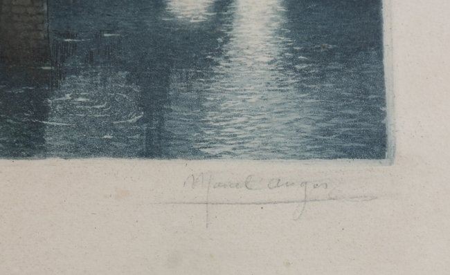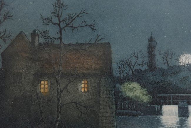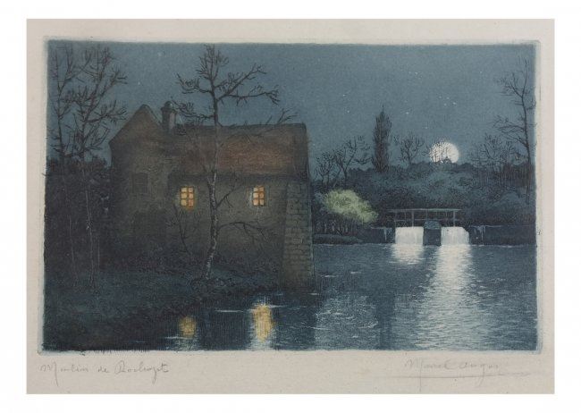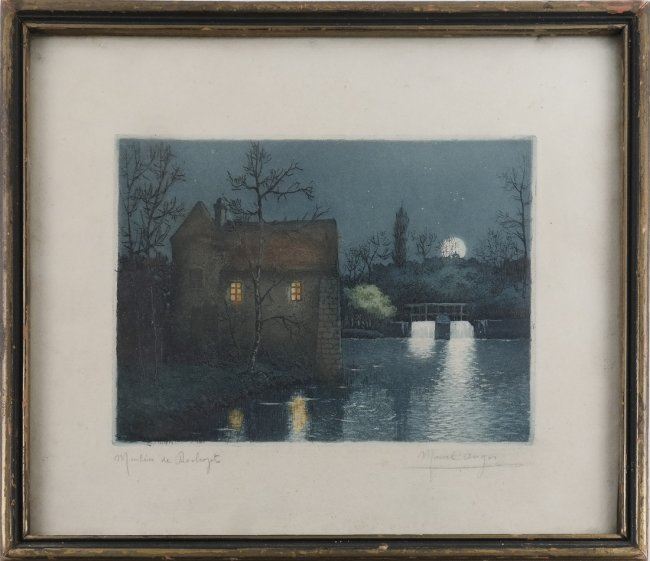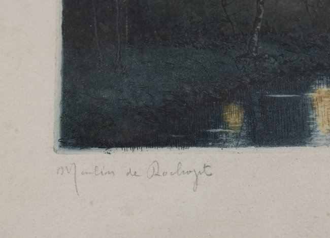 Hand-colored etching "Moulin de Rochfort" evening scene with moonlight, signed illegibly lower right. [Sight: 5 1/2" H x 8" W; Frame: 9 1/2" H x 11 1/2" W]. In good condition, not examined out of frame.