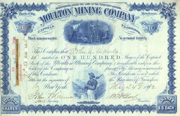 1892, Montana. Stock certificate for 100 shares of Moulton Mining Company. Blue. Vignette of miners at work at top center and man at bottom center. Signed twice by W. A. Clark as President and on verso. CLARK, WILLIAM A. (1839 - 1925). Montana Senator; Mining capitalist; Clark is best known for his long-time feud with Marcus Daly.