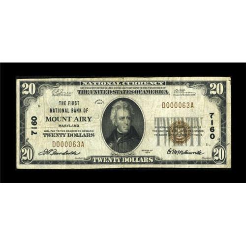 <B>Mount Airy, MD</B></I> - $20 1929 Ty. 1 <B>The First NB</B></I> Ch. # 7160<BR> Low serial number 63 graces this <B>Very Good-Fine</B></I> example which is just the seventh small size to surface on this rare bank. While this note has seen its share of circulation, it is problem free for the grade.<BR><BR><b>Shipping:</b> Coins & Currency (<a target="_blank" href="http://www.heritageauctions.com/common/shipping.php">view shipping information</a>)
