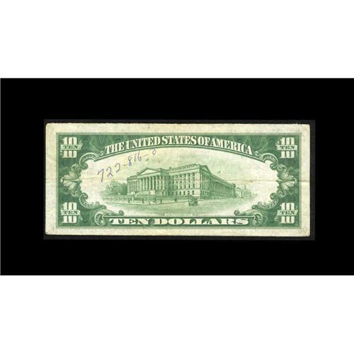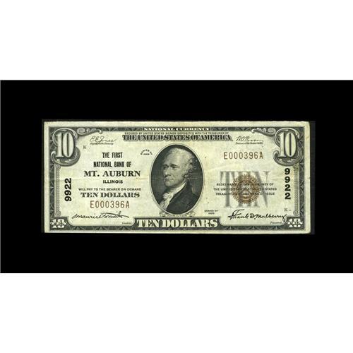 <B>Mount Auburn, IL</B></I> - $10 1929 Ty. 1 <B>The First NB</B></I> Ch. # 9922<BR>This note from this one bank town in Christian County faces up quite well. There are a couple of pinholes and a bit of ink on back, but the overall eye appeal is acceptable. <B>Very Fine.</B></I>