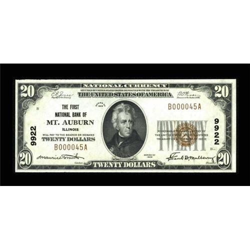 <B>Mount Auburn, IL</B></I> - $20 1929 Ty. 1 <B>The First NB</B></I> Ch. # 9922<BR> A lovely note which is tied with one other uncirculated example as the finest known example from here, large or small. Bright <B>Choice Crisp Uncirculated.</B></I><BR><BR><b>Shipping:</b> Coins & Currency (<a target="_blank" href="http://www.heritageauctions.com/common/shipping.php">view shipping information</a>)