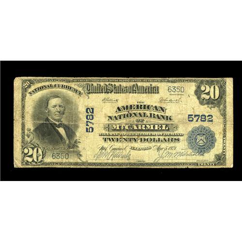 <B>Mount Carmel, IL</B></I> - $20 1902 Plain Back Fr. 659 <B>The American NB</B></I> Ch. # 5782<BR>Although small size notes from here do show up, large examples are quite difficult to obtain. <B>Very Good+.</B></I>