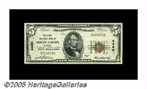 <B>Mount Carmel, IL</B></I> - $5 1929 Ty. 1 <B>The First NB</B></I> Ch. # 4480<BR>A nice mate for the example from this town's other bank, offered below. <B>Extremely Fine</B></I> and about as nice looking as a circulated note can possibly be.