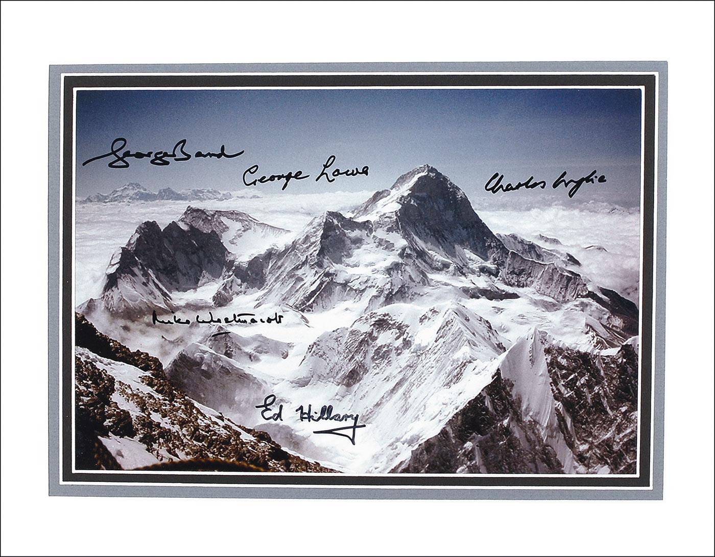 Color glossy 11 x 7.5 photo of Mount Everest, signed in black felt tip by five members of the 1953 expedition team: Edmund Hillary, George Lowe, George Band, Mike Westmacott, and Charles Wylie. Triple matted to an overall size of 14 x 11. In very fine condition.