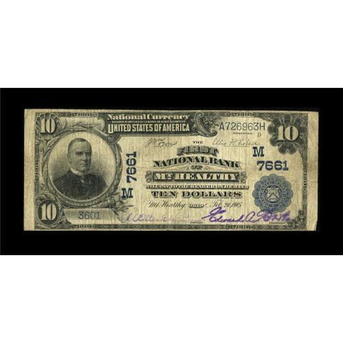 <B>Mount Healthy, OH</B></I> - $10 1902 Plain Back Fr. 624 <B>The First NB</B></I> Ch. # (M)7661<BR> A popular locale with no large size auction appearances since 2004. This piece has pleasing paper and decent blue signatures. <B>Fine.</B></I><BR><I>From The Kansas City Collection.</B></I><BR><BR><b>Shipping:</b> Coins & Currency (<a target="_blank" href="http://www.heritageauctions.com/common/shipping.php">view shipping information</a>)