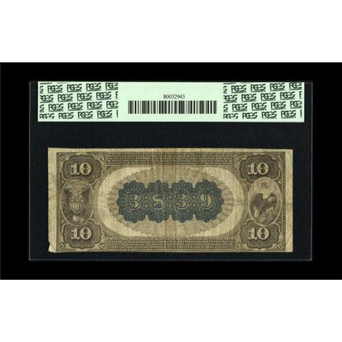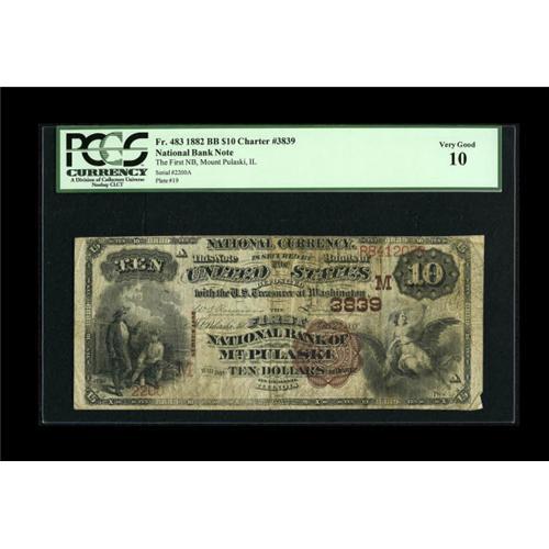 <B>Mount Pulaski, IL</B></I> - $10 1882 Brown Back Fr. 483 <B>The First NB</B></I> Ch. # (M)3839<BR>While not a particularly rare bank with nearly two dozen large size notes known, only three Brown Backs are known on this bank, this being the only $10. We are bewildered by the <B>PCGS Very Good 10</B></I> grade as this is a full Fine note without a single break in the paper and most importantly bold color front and back. There is little wonder why the census lists this beauty as Fine.