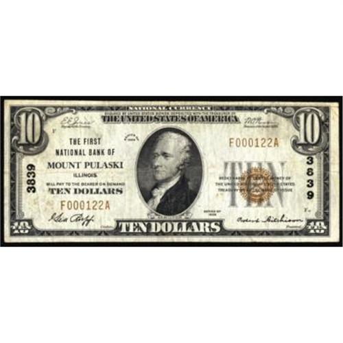 Mount Pulaski, IL $10 1929. FNB Charter #3839 F+