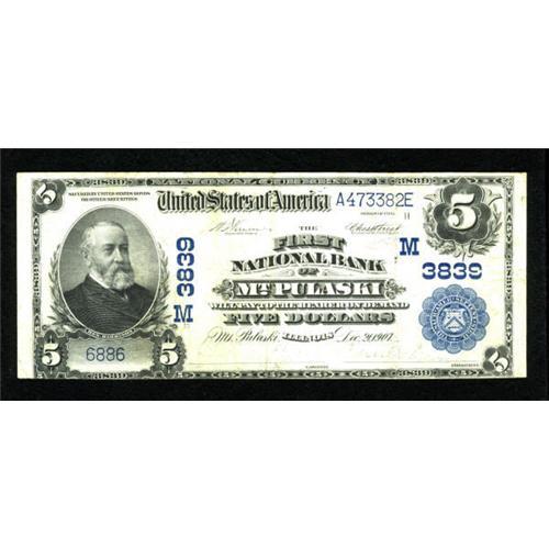 <B>Mount Pulaski, IL</B></I> - $5 1902 Plain Back Fr. 600 <B>The First NB</B></I> Ch. # (M)3839<BR> A pleasing note that offers a couple key features for number fanatics. <B>Very Fine</B></I>.<BR><BR><b>Shipping:</b> Coins & Currency (<a target="_blank" href="http://www.heritageauctions.com/common/shipping.php">view shipping information</a>)