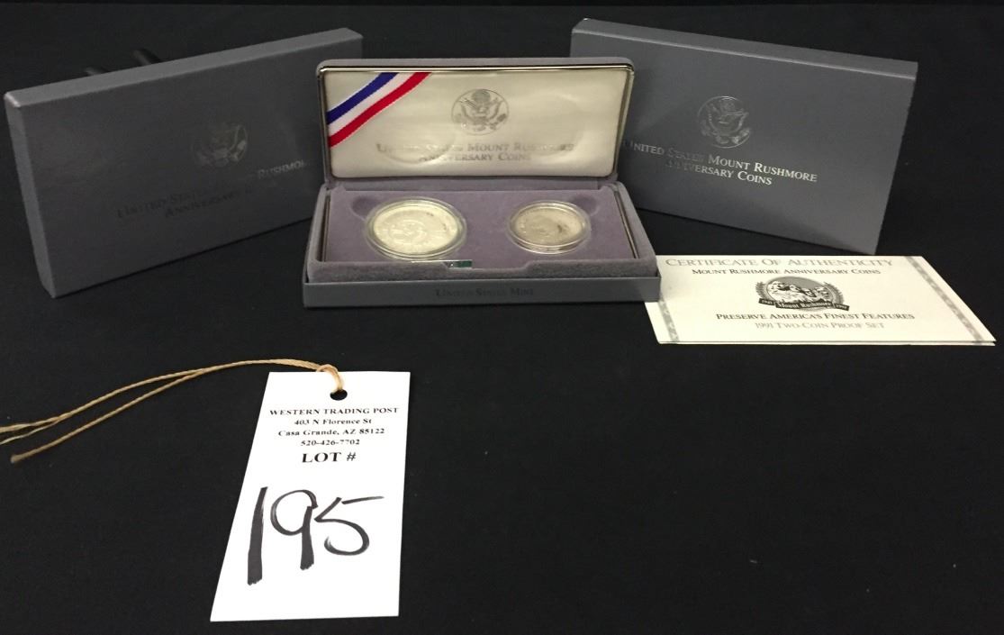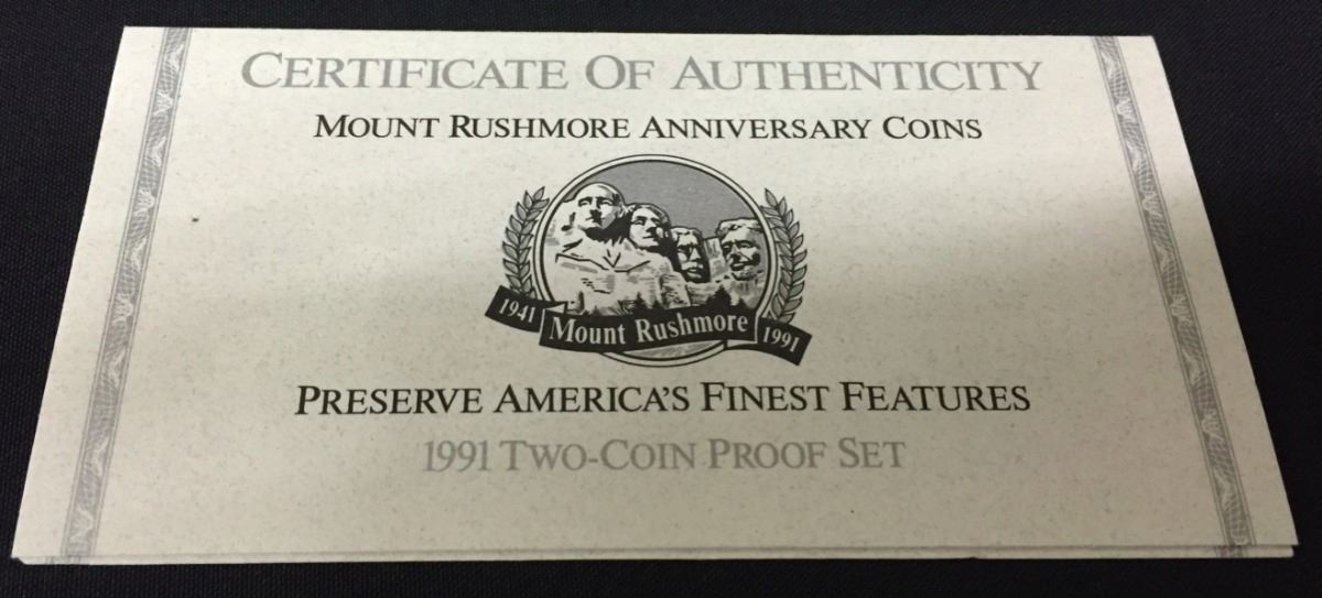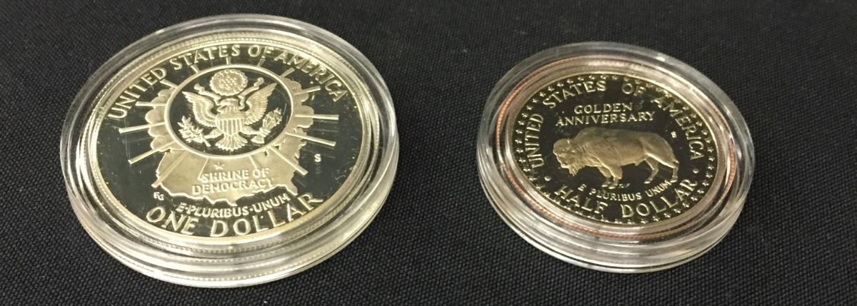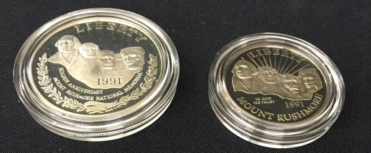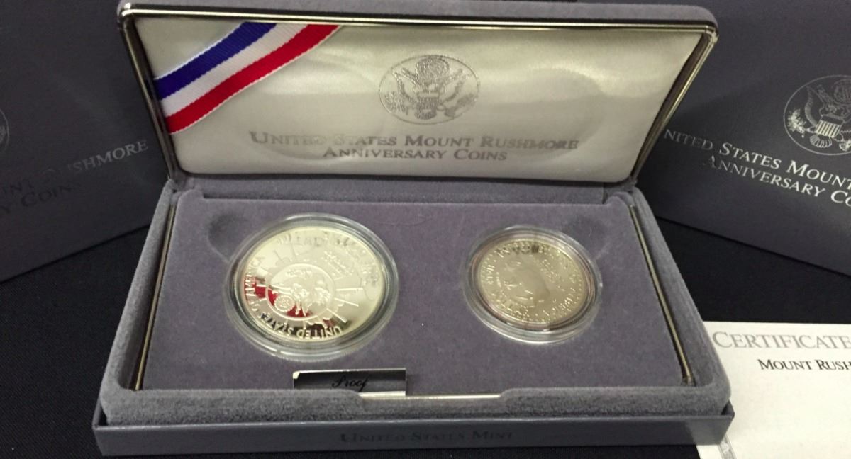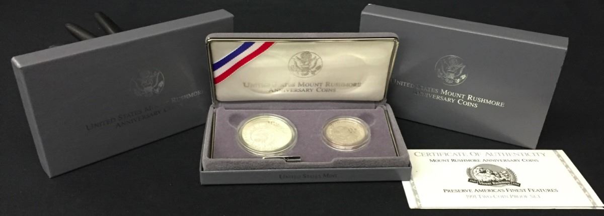 A United States Mount Rushmore anniversary coin set featuring a $1 and a .50 cent coin. Marked as silver proofs. Please look closely at the pics as they are an important part of our description. Shipping: There will be a $5 handling / packaging fee for shipping this lot. The actual cost of postage will be added on top of that.