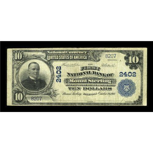 <B>Mount Sterling, IL</B></I> - $10 1902 Plain Back Fr. 632 <B>The First NB</B></I> Ch. # 2402<BR>This discovery piece is from a one bank town. <B>Very Good-Fine.</B></I><BR><I>From The Lincoln Collection</B></I><BR><BR><b>Shipping:</b> Coins & Currency (<a target="_blank" href="http://www.heritageauctions.com/common/shipping.php">view shipping information</a>)