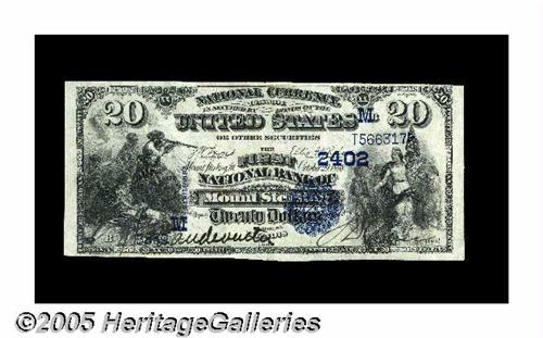 <B>Mount Sterling, IL</B></I> - $20 1882 Value Back Fr. 581 <B>The First NB</B></I> Ch. # 2402<BR>Value Backs as a type are quite elusive, having been issued only from 1916-1922. This <B>Extremely Fine</B></I> example is in a state of preservation seldom encountered in this highly sought-after type. The paper surfaces retain full original crispness and the few folds present are all quite light. The officers' dark sink signatures are a further enhancement.