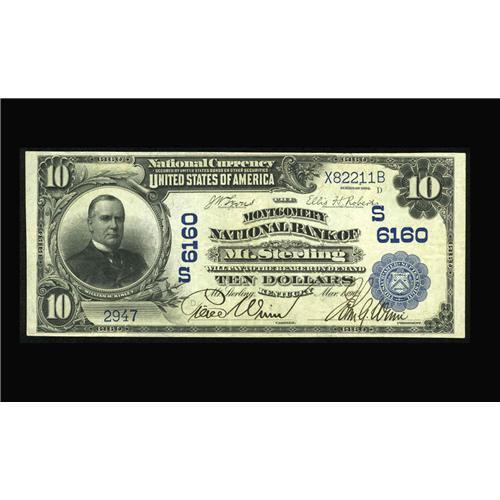 <B>Mount Sterling, KY</B></I> - $10 1902 Plain Back Fr. 624 <B>The Montgomery NB</B></I> Ch. # (S)6160<BR>Have we mentioned just how obsessed Bile Gale was with quality when he picked out the notes he wanted in his collection? Having catalogued many a state collection, your cataloguer is in awe of the notes in the Gale holdings. Bank after bank, note after note, always either a First or Second Charter, or a Red Seal, or a high denomination, or the earliest note known, or in many cases, that combined with the finest known from the bank as well. For rarity, quality and completeness, this is a collection that will set the standard for the next generation of collectors. This example, a pen signed beauty, is the highest grade of any large note in the census from this institution, a bank with just $820 outstanding in 1935. <B>Very Fine+++.</B></I>