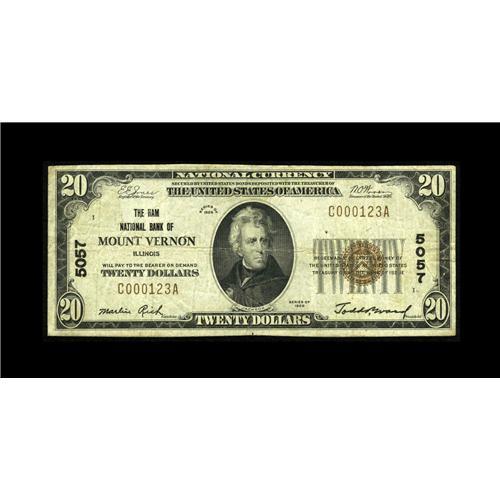 <B>Mount Vernon, IL</B></I> - $20 1929 Ty. 1 <B>The Ham NB</B></I> Ch. # 5057<BR>Four small notes are known on this institution that certainly sustained the farming industry in this southern Illinois hamlet. A few pinholes are seen on this nicely centered example. <B>Fine.</B></I>