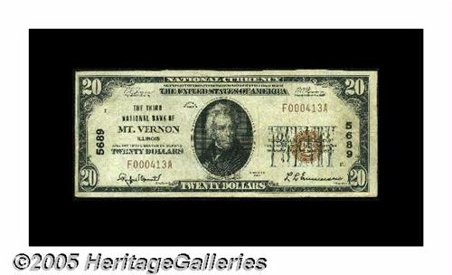 <B>Mount Vernon, IL</B></I> - $20 1929 Ty. 1 <B>The Third NB</B></I> Ch. # 5689<BR>We sold another Type 1 Twenty from here in our February 2005 Taylor Family Collection sale for $345. It was badly cut at the bottom. This fully margined example ought to do a bit better. <B>Very Fine.</B></I>