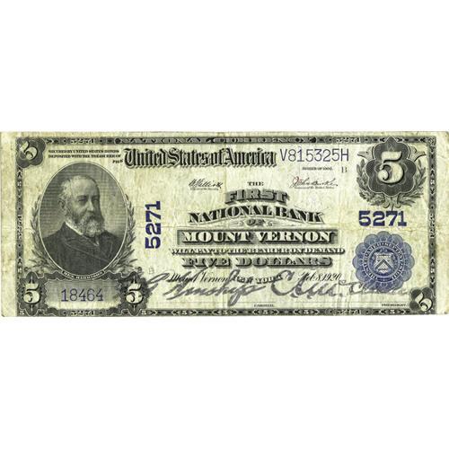 <B>Mount Vernon, NY</B></I> - $5 1902 Plain Back Fr. 607 <B>The First NB</B></I> Ch. # 5271<BR>A nice looking <B>Fine</B></I> $5 Plain Back from strongly collected Westchester County. The bottom margin is tighter than we'd like to see, but the stamped signatures are quite strong and there are no pinholes.