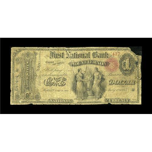 <B>Mount Vernon, OH</B></I> - $1 Original Fr. 380 <B>The First NB</B></I> Ch. # 908<BR>This bank only had four large enumerated before the appearance of this note. Only one other of those counted notes is a First Charter note and it has never come up for auction. The upper right-hand corner is missing and there is a repair in the same vicinity on the back. Still the Ace faces up well for what it has gone through. <B>Good-Very Good.</B></I><BR><BR><b>Shipping:</b> Coins & Currency (<a target="_blank" href="http://www.heritageauctions.com/common/shipping.php">view shipping information</a>)