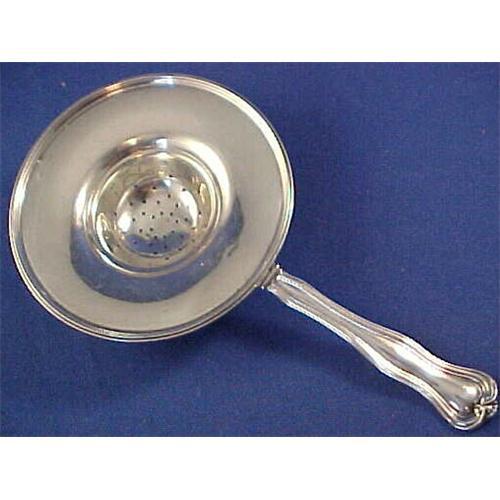 What an unusual piece! This sterling silver tea strainer is in the elegant Mount Vernon pattern by Watson. The strainer part is rather large and is designed to be held over the tea cup. This piece is 6 1/4" long and 3 1/2" across. There are 2 tiny, pin point dings near the rim of the bowl, but this piece is otherwise in great shape.