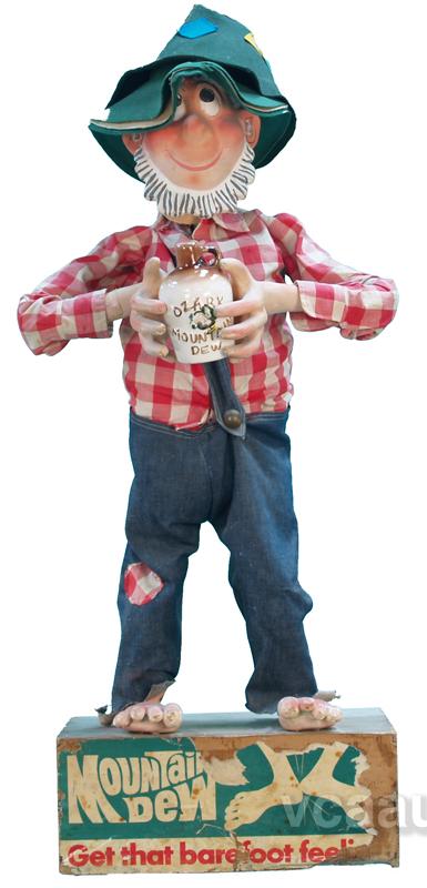 Mountain Dew "Hill-Billy" Statue Advertising Display "Get That Barefoot Feeling" w/ 2 hats & glass jug - approx. 46" tall