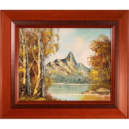 This magnificent original landscape, done by a very accomplished Canadian artist, portrays a dynamic scene that depicts a majestic mountain bordered by lovely autumnal trees that are dressed in lively colors. The placid lake reveals masterfully done reflections and the calm that can be felt in the surrounding environment. The paint was applied very liberally, creating a surface relief that makes the trees and mountain range look extraordinarily real. The painting is framed in a distinctive two toned brown wood frame, a smooth walnut coupled with a deep pecan inlay. This special frame works as an accent piece that enhances the darker tones while highlighting the lighter ones. The art work?s dimensions are 13 5/8? x 11 5/8?, which includes the frame as well. This painting is perfect for anyone who loves the grandeur of nature and is a real steal considering the high quality of the work itself.