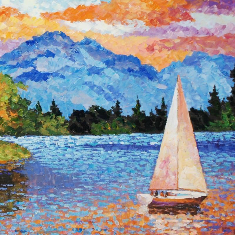 "Mountain Lake Sailing" is a limited edition hand embellished giclee on canvas, numbered inverso and hand signed by Alexander Antanenka. Includes Certificate of Authenticity! Measures approx. 30" x 24" (image).