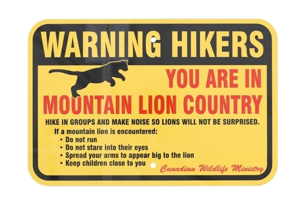 For your consideration is this Mountain Lion sign from Canada. The sign is from the Canadian Wildlife Ministry and reads, "Warning Hikers You Are In Mountain Lion Country." The sign is a high visibility yellow and features a silhouette image of a Mountain Lion. The sign is in very good condition and measures 12" x 18".*