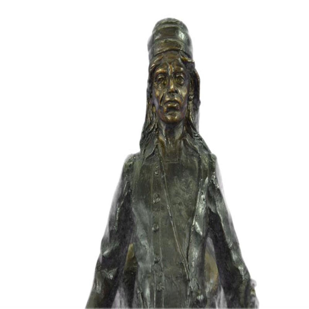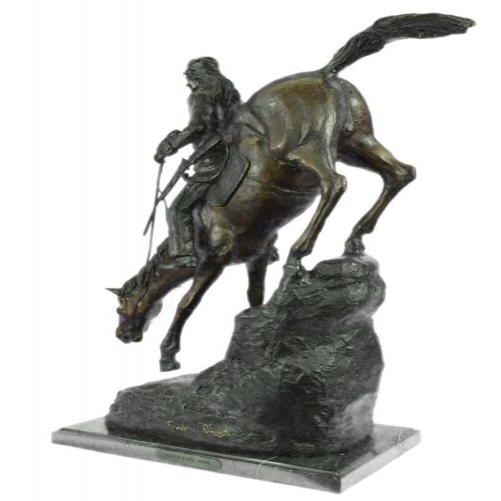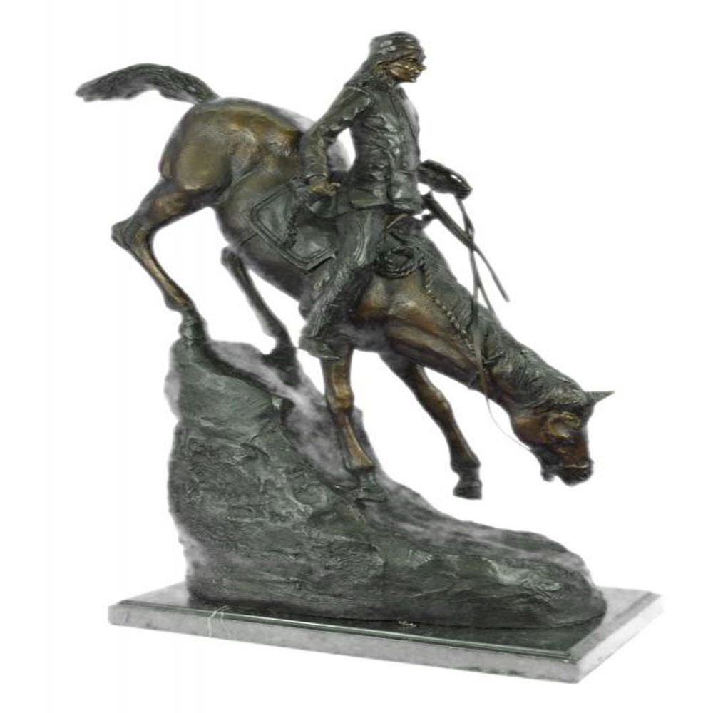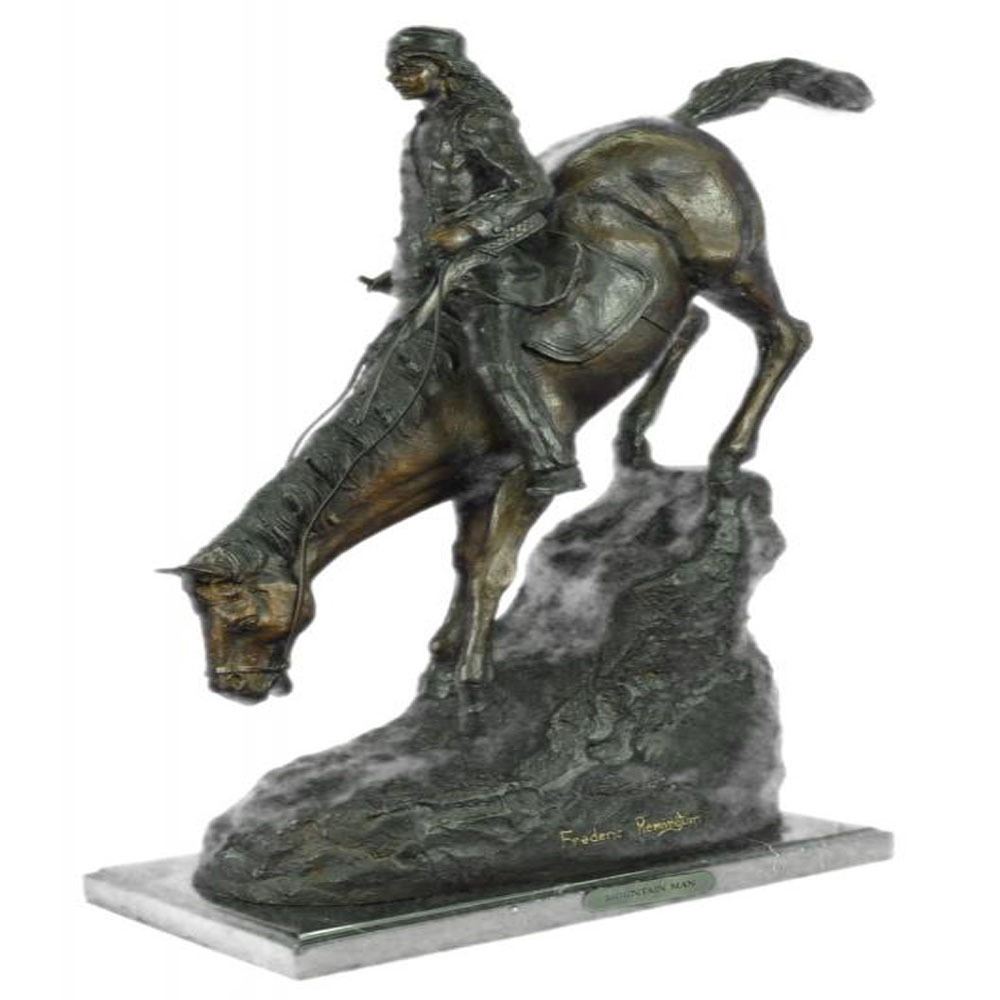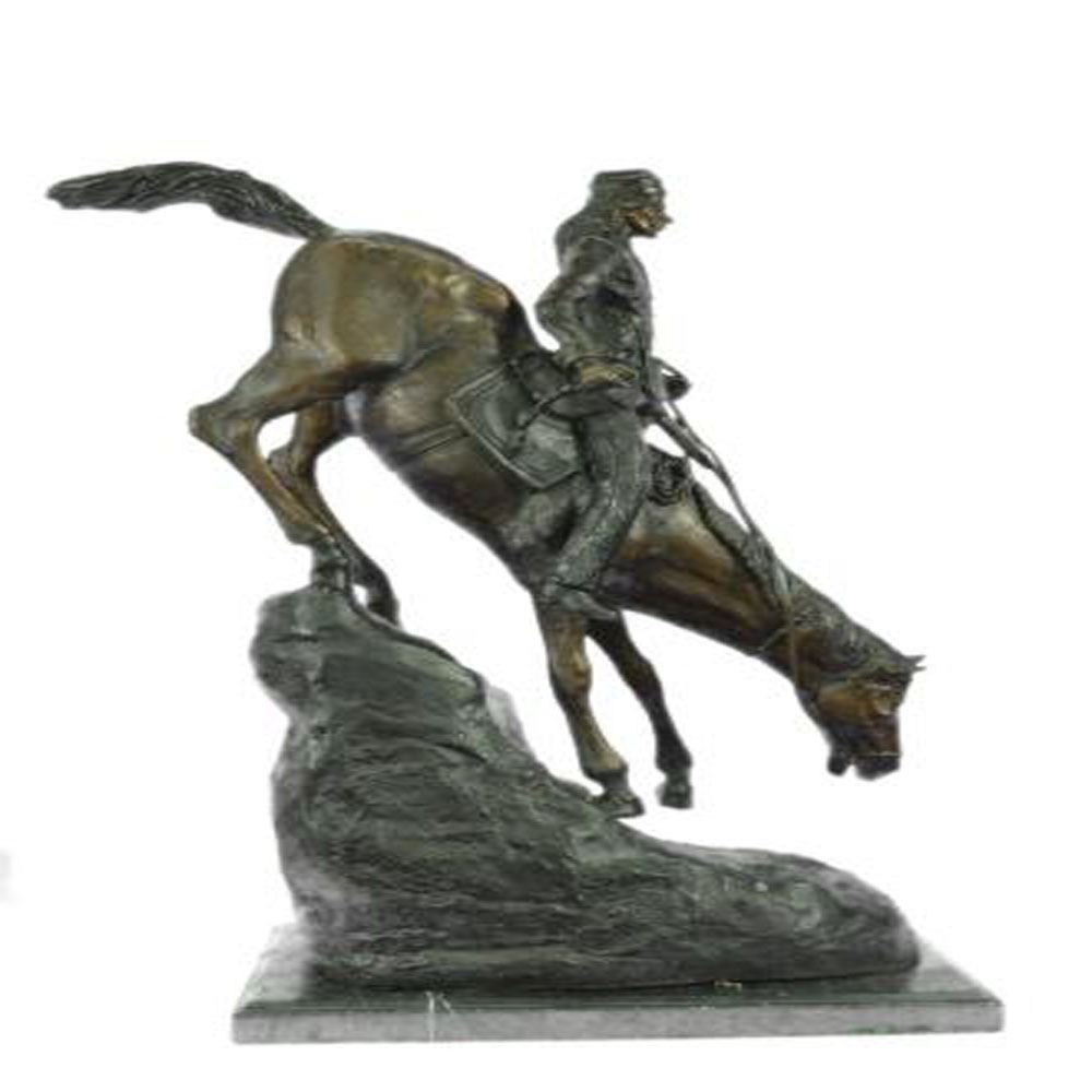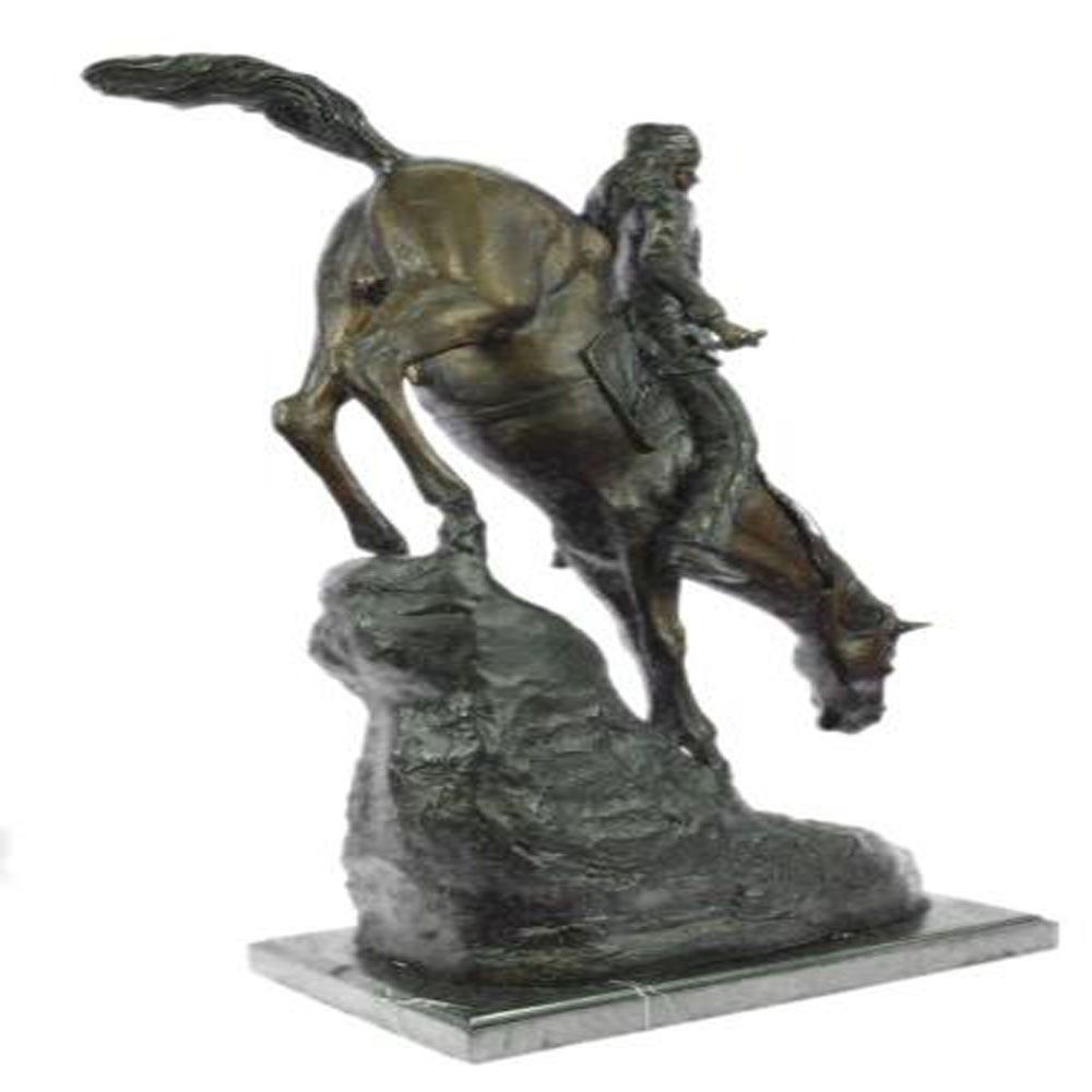 A lone cowboy sets out on a long journey. His loyal horse slowly descends a slanted mountain. His long legs navigate the rough terrain carefully. The cowboy sits tall and clutches the reins. This two-toned brown patina Sculpture was cast using the Lost Wax Method and mounted on a marble base. Dimensions: Height 26 X Width 31 inches. Weight: 33 LBS.
