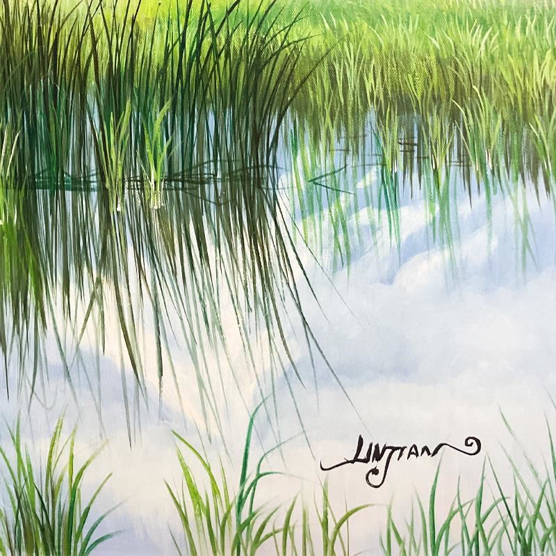 "Mountain Pond with Grass" is an original oil painting on canvas by Lin Jian, hand signed by the artist. This piece comes framed. Includes Letter of Authenticity. Measures approx. 43.5" x 31.5" (frame), 35.5" x 23.5" (image). There is some wear on the frame.